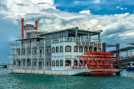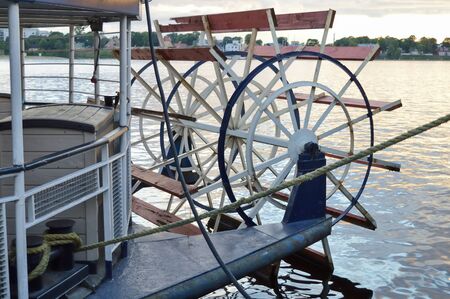 paddle wheel of old cruise steamer ship, moored on a river pier on a summer evening