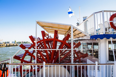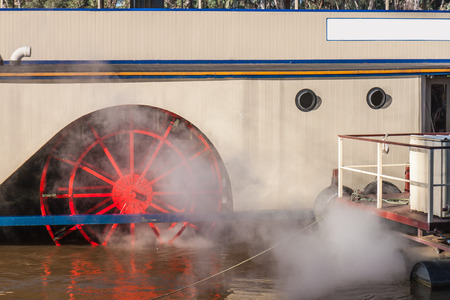 Red and white wheel of the old steamboat on the river.