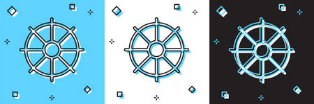 Set Dharma wheel icon isolated on blue and white, black background. Buddhism religion sign. Dharmachakra symbol. Vector