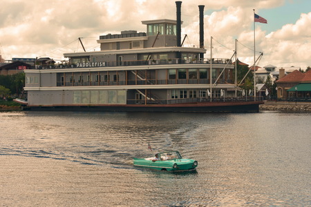 Orlando, Florida. October 19, 2018 Amphibious car ride on restaurant and cloudy sky at Lake Buena Vista.