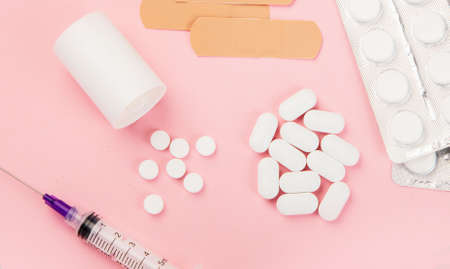 Medications and pills on a white background closeup shot
