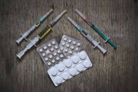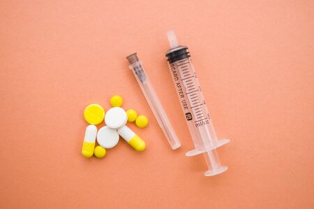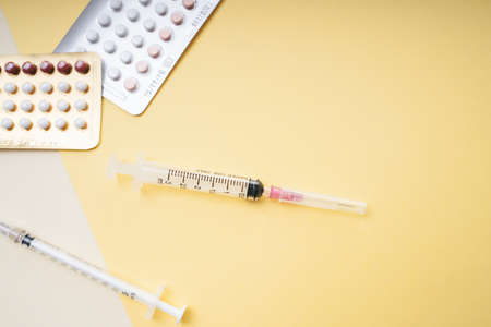 White, yellow and rose tablets pills and three syringes on the table