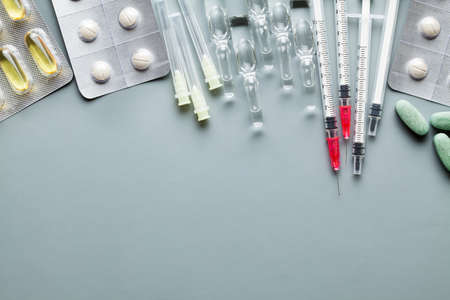 Medications in tablets and injections on a gray background
