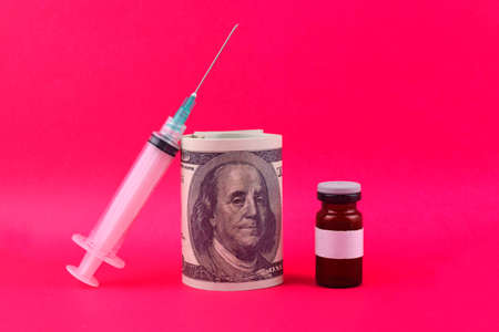 Medical bootle with dollars, variegated pills, ampullas and expendable syringes for vaccination. The concept of insurance medicine. Efficiency of healthcare system.