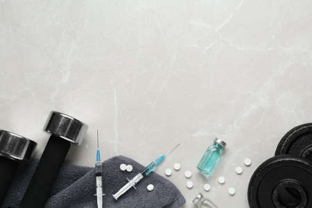 Different drugs and sports equipment on gray background, flat lay with space for text. Doping control