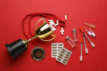 Flat lay composition with drugs on red background. doping control