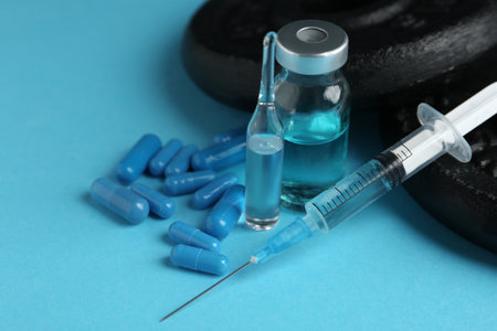 Various drugs and sports equipment on turquoise background, closeup. doping control