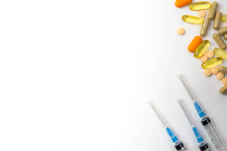 Tablets and a syringe on a white background. A syringe for injection. Tablets, capsules for the treatment of patients.