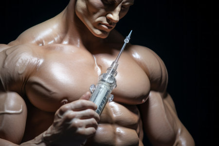 Unveiling the Dark Side: Intense Close-up of Muscular Man Administering Steroids at the Gym --ar 3:2
