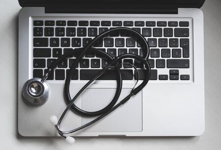 Desktop table with stethoscope and laptop, top view with copy space. Telemedicine concept