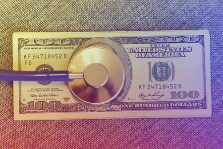 Financial checkup: Stethoscope on pile of U.S. hundred dollar bill on grey background. financial wellness. toned.