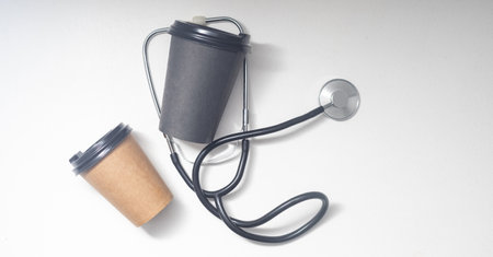 Young beautiful nurse with stethoscope holding a cup of coffee