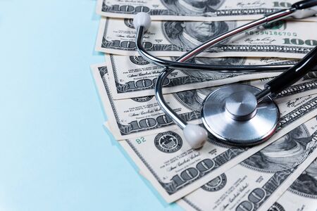 Stack of cash dollars and stethoscope on blue background. The concept of medical strechevka or expensive medicine, doctors salary. Copy space for text