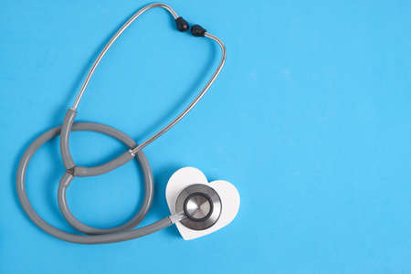 White heart and stethoscope on blue background.Heart disease, medical examination