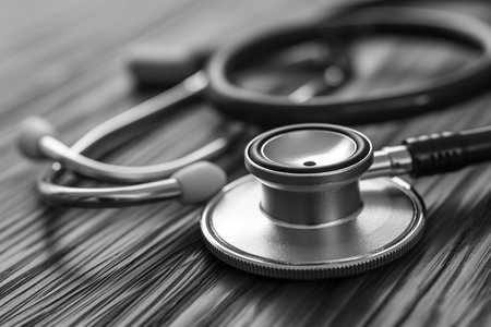 A close-up image capturing a professional stethoscope on a table, evoking themes of healthcare and the medical profession in a soft, blurred background.