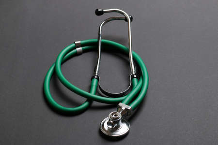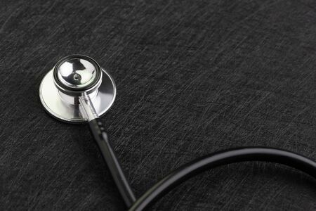 Stethoscope with black cable on dark texture background with copy space using as medical, hospitality and health care concept.