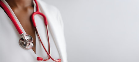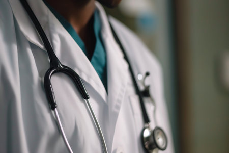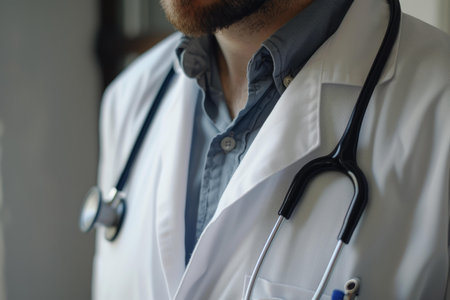 Detail shot of a male doctor in lab coat with a stethoscope around the neck