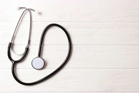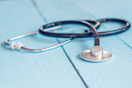 Stethoscope on wooden table background. medical health concept. Rubber, tool.