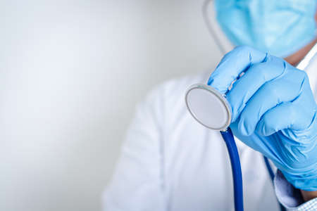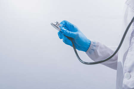 A doctor in a medical gown and blue gloves with a stethoscope in his hands in a hospital on a white background. selective focus. close-up