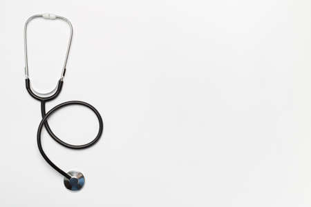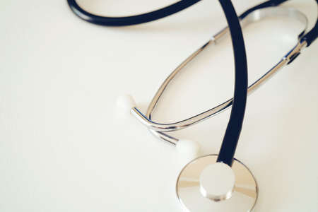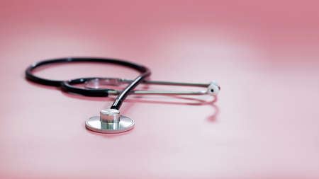 Selective focus to black stethoscope. Stethoscope for doctor checkup on health medical laboratory. Medical concept image.