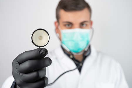A cardiologist in a medical mask holds a stethoscope in his hand.