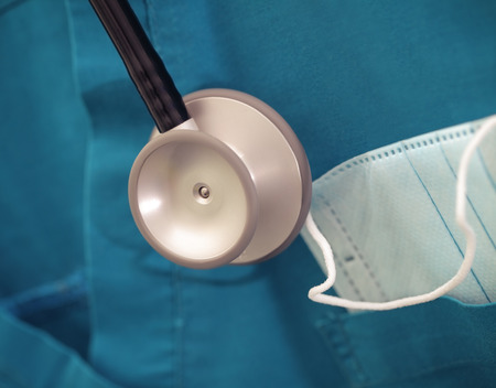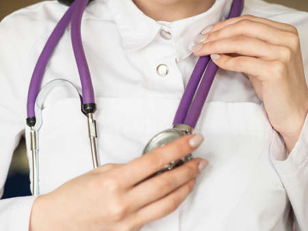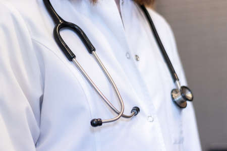 Close-up view of a hospital apron with a stethoscope in his hand.
