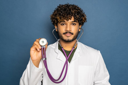 pakistanian doctor in white coat with stethoscope over blue studio background
