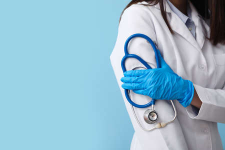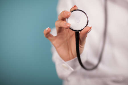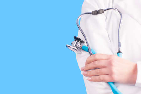 Medical examination, diagnostics and health protection. Doctor woman in white coat holds stethoscope in her hand and ready to patient visit, isolated on blue background, close up, free space, cropped