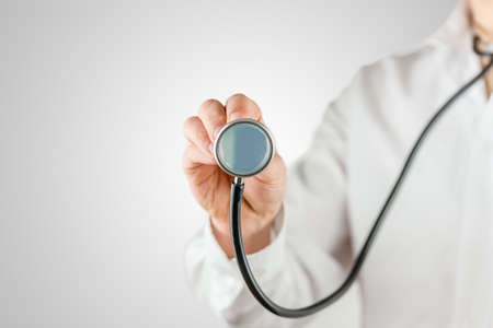 Doctor with stethoscope in the hands close up on the gray background with copy space.