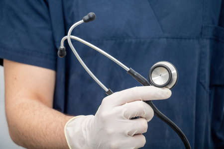 Doctor in medical uniform holds, in hand with disposable glove, stethoscope that consists of disk shaped resonator and tube with earpiece. Healthcare concept.