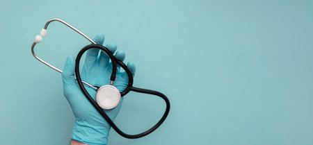 Close up of doctor hands in gloves with stethoscope, medical exam concept.