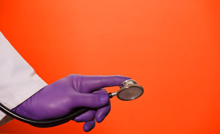 Stethoscope in the hands of a doctor with lilac surgical gloves, orange background