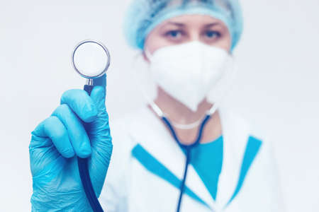 Indoor blurred shot of young adult woman doctor wearing medical cap, gloves and protective mask showing stethoscope to camera, equipment for diagnostic.