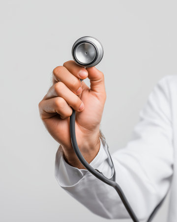Medical stethoscope in hand,Doctor holding examination device for pulse,Healthcare and medical concept