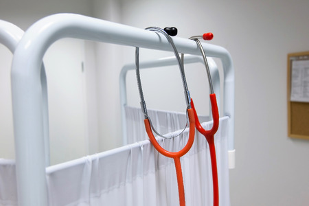 a pair of stethoscopes hung on hospital cover in hospital room
