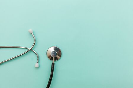 Medical stethoscope isolated on blue background. Diagnostic tool for doctor, listening to the lungs for inflammation. Health care concept. Copy space, top view, flat lay, banner.