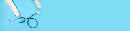 Puppy dog border collie paws and stethoscope isolated on blue background. Little dog on reception at veterinary doctor in vet clinic. Pet health care and animals concept. Banner