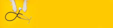 Puppy dog border collie paws and stethoscope isolated on yellow background. Little dog on reception at veterinary doctor in vet clinic. Pet health care and animals concept. Banner