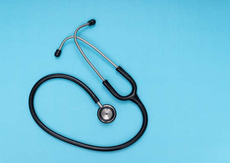 Black stethoscope, top view on the blue background. Medical equipment