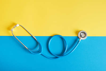 The stethoscope lies on the national flag of Ukraine yellow and blue, martial law in Ukraine, medical care in the war
