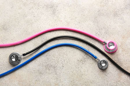 Modern stethoscopes on light background