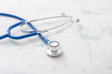 Medical concept. Stethoscope on doctor desk. Blue background