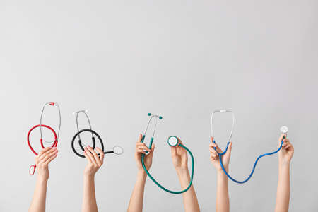 Many hands with stethoscopes on gray background