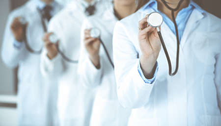 Group of doctors holding stethoscope head close-up. Physicians ready to examine and help patient. Medicine concept