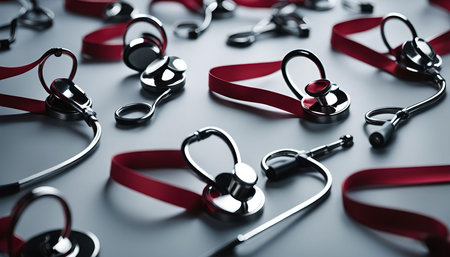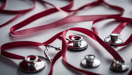 A close-up image showcasing multiple stethoscopes laid out on a white background, with red ribbons tied around some of them, creating a visually engaging healthcare symbolism.