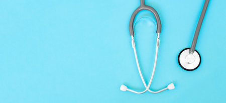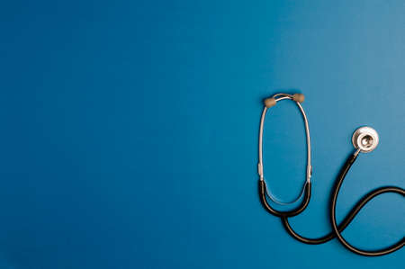 Medical stethoscope isolated on blue background. Diagnostic tool for doctor, listening to the lungs for inflammation. Health care concept. Copy space, top view, flat lay, banner.