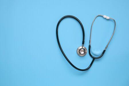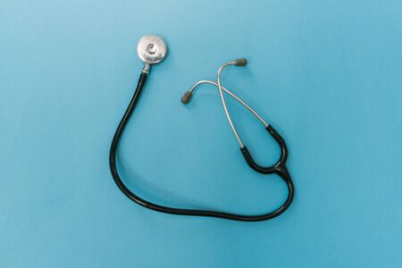 Black stethoscope, top view on the blue background. Medical equipment