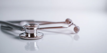 A close-up captures a stethoscope on a reflective surface. The medical instrument is silver and black, with a shallow depth of field. A blurred background with bokeh suggests an indoor environment. This image is suitable for healthcare, medical, and wellness related publications and promotions.