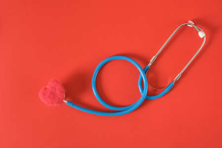 heart made of wool and a medical stethoscope on a bright red background copy space top view