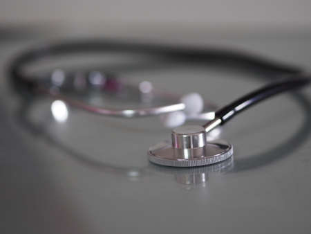 Selective focus to black stethoscope. Stethoscope for doctor checkup on health medical laboratory. Medical concept image.